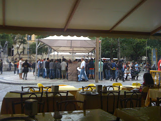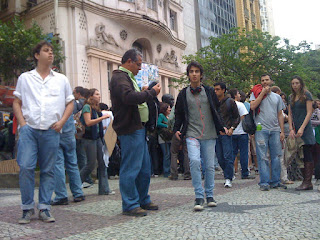 Hoje fui até a Cinelândia participar da assembléia geral do Ocupa Rio. No caminho passei na casa de um amigo, no Leme, e seguimos pra cidade. Chegamos por volta de 12h30 e demoramos um pouco pra localizara a galera. Tinha uma empresa de eventos montando a estrutura pro Circuito Light Rio Antigo - Etapa Cinelândia, uma prova desportiva marcada pro dia seguinte.
