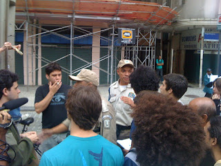 A polícia também passou por lá, enquanto a PM apenas observou - algumas viaturas transitaram fazendo normalmente sua ronda, como é de costume na Cinelândia - a Guarda Municipal abordou as pessoas do movimento por duas vezes, uma pra pedir que saíssemos da área onde estava sendo montada a estrutura para a prova atlética do domingo (corrida e caminhada) e em outra oportunidade de forma mais incisiva, orientando para que não fosse afixado nada nas árvores e monumentos do local. Tudo também dentro da normalidade, os agentes foram educados e não reprimiram a manifestação, respeitaram nossos direitos numa boa. Neste momento houve apenas um pouquinho de tensão, devido a truculência que o movimento sofreu por parte das autoridades em outras cidades.