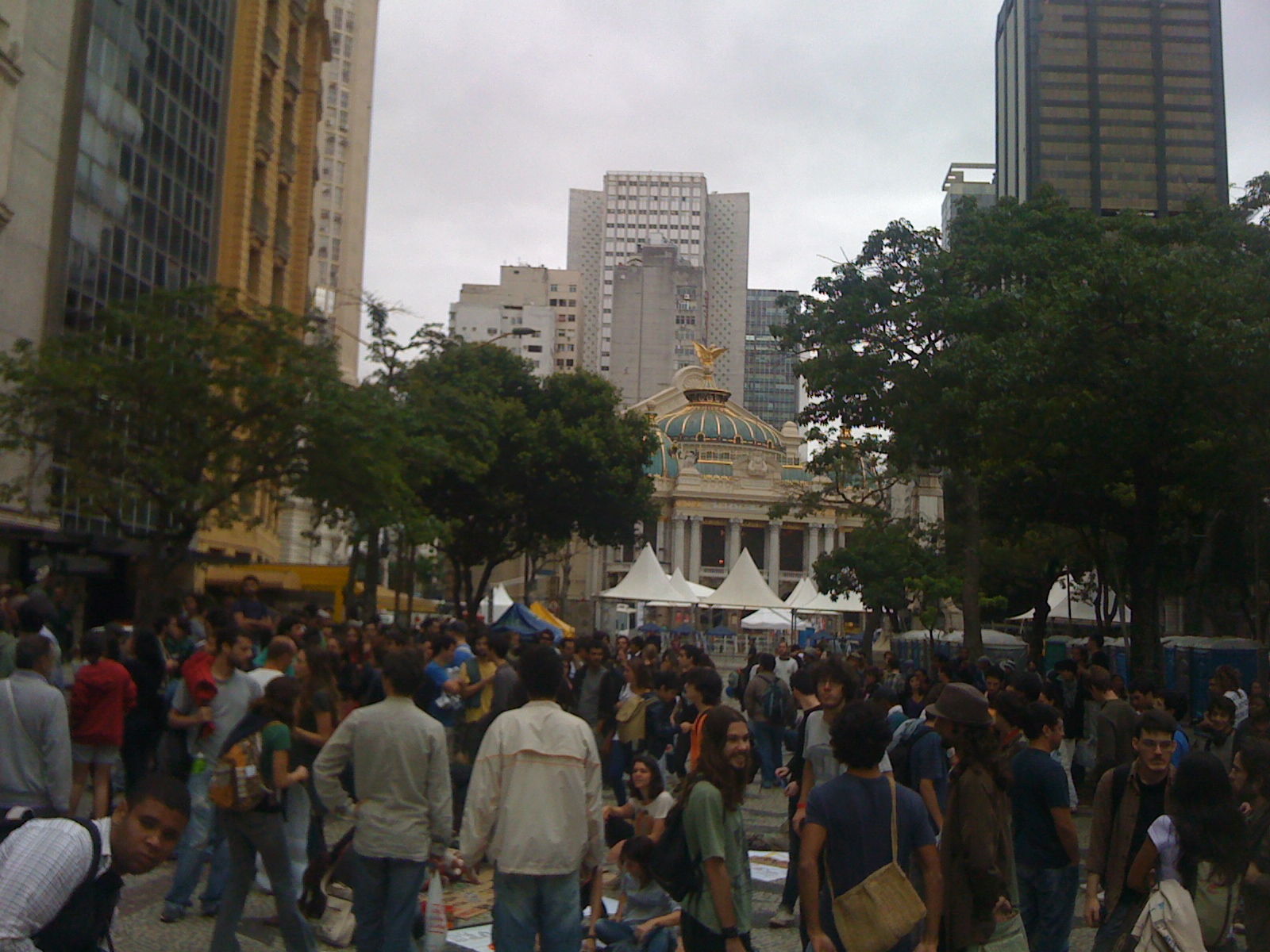 Passei horas lá na Cinelândia, e olhando ao redor percebi que o lugar foi muito bem escolhido. Ali se vê a riqueza gasta pra reformar o Teatro Municipal, palco de grandes espetáculos destinados a nata da sociedade carioca, a câmara de vereadores, centro do poder municipal da cidade do Rio, a Biblioteca Nacional, bancos, comércio e bares/restaurantes onde uma água mineral pequena custa 3 reais, um sanduíche de pão com bife 10 reais. Ao mesmo tempo a Praça da Cinelândia abriga uma das maiores populações de moradores de rua da cidade. Ali se vê perfeitamente o abismo social no qual vivemos, é um lugar emblemático.