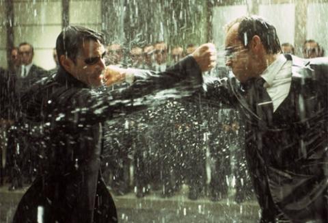 *Imagens da Trinity lutando com o agente que apareceu no sonho de Neo tomam os monitores*